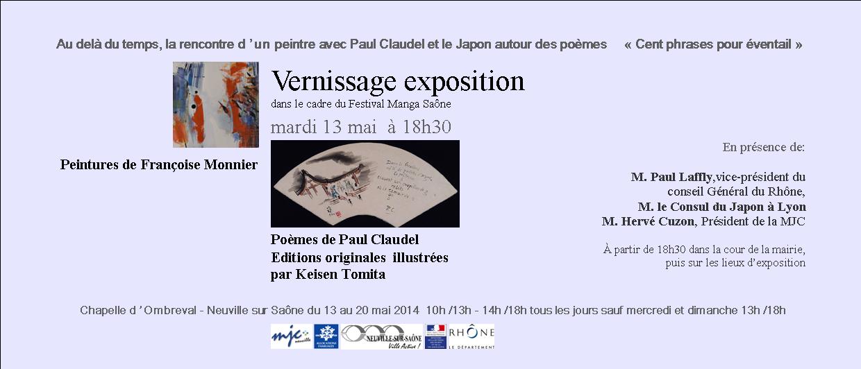 Peintures de Françoise Monnier mises en relation avec les poèmes de Paul Claudel issus du recueil « Cent phrases pour éventail » écrit par Paul Claudel lorsqu’il était ambassadeur au Japon. Ce recueil de poèmes accompagne Françoise depuis 40 ans et les peintures présentées s’étalent sur près 20 ans. La famille de Paul Claudel a accepté de prêter pour cette exposition des oeuvres en leur possession: une édition originale de « Cent phrases pour éventail » ainsi que 4 oeuvres originales illustrées par Keisen Tomita, artiste japonais qui a travaillé avec Paul Claudel au Japon.